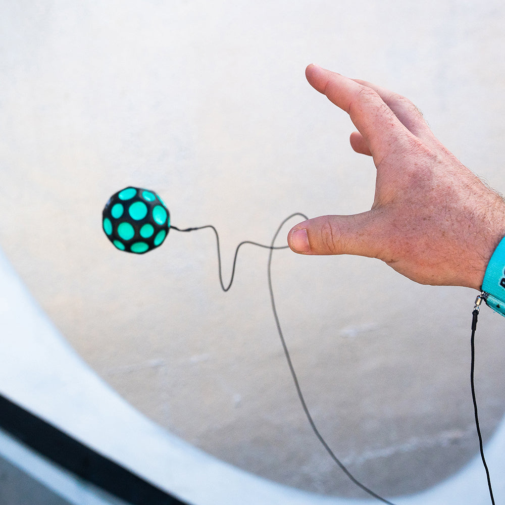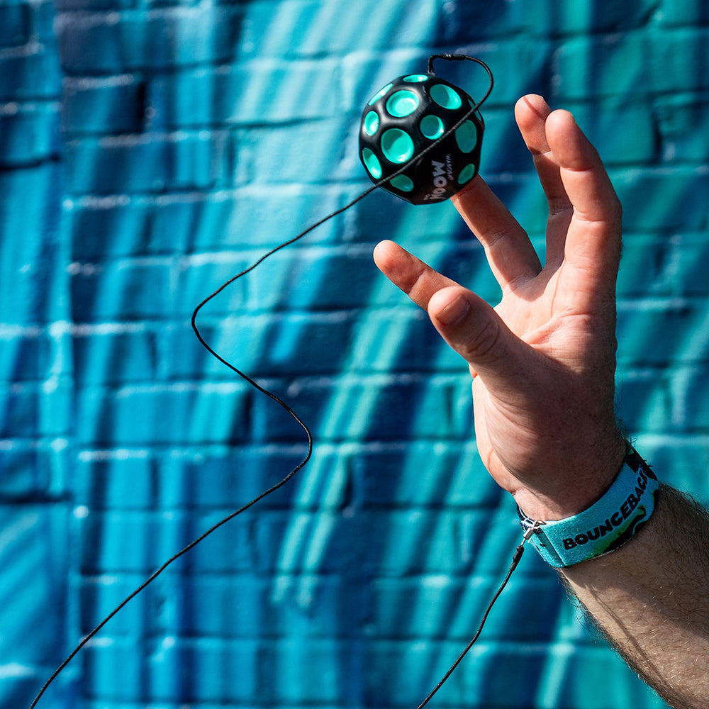 Bounceback are o minge Moon ball atasata la o curea pe care o porti la încheietura, reglabila. Pur si simplu arunc-o in fata ta, astfel incat sa ricoseze, si prinde-o cand revine!