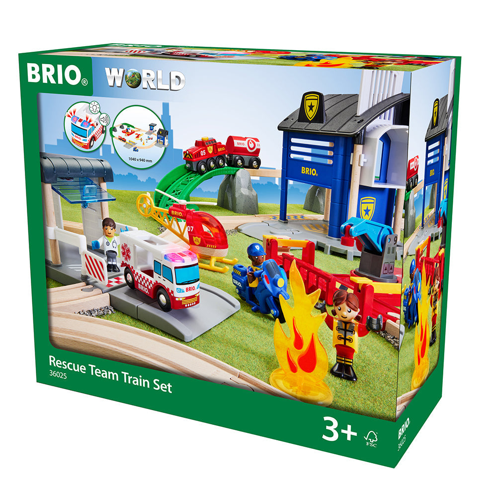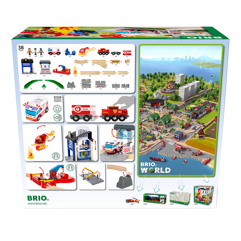 Contine: 1 sectie de politie, 1 motocicleta de politie, 1 garaj de spital, 1 ambulanta, 1 tren de pompieri, 1 elicopter de pompieri, 3 figurine, 2 sine curba in panta, 2 suporturi pentru tren de munte, 13 sine din lemn, 1 sina de platforma cu macara, 1 trecere rutiera/ferata si accesorii.