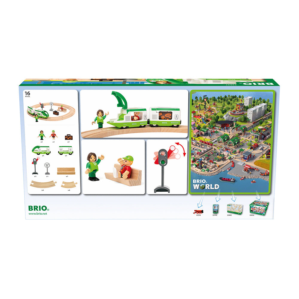 Set trenulet cu sine si figurine + accesorii feroviare - BRIO, este un set cu traseu de sine rotund, trenulet de pasageri verde, figurine si accesorii feroviare.