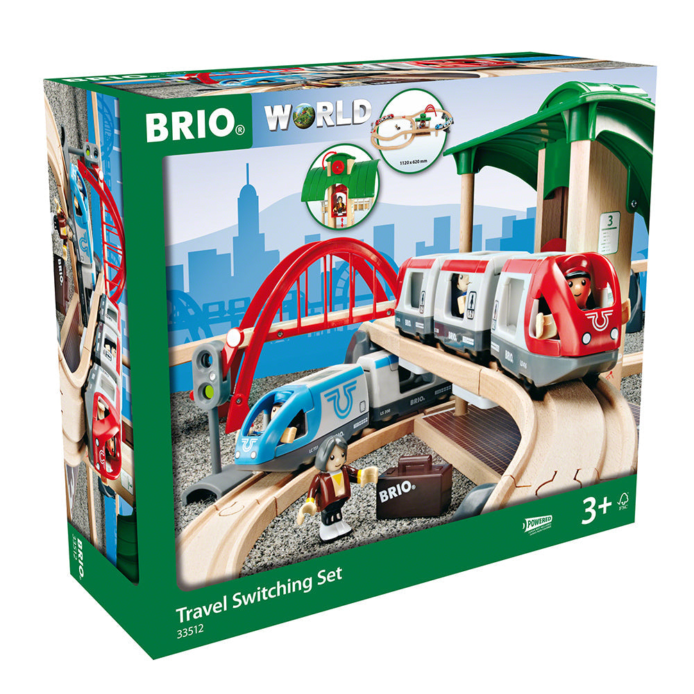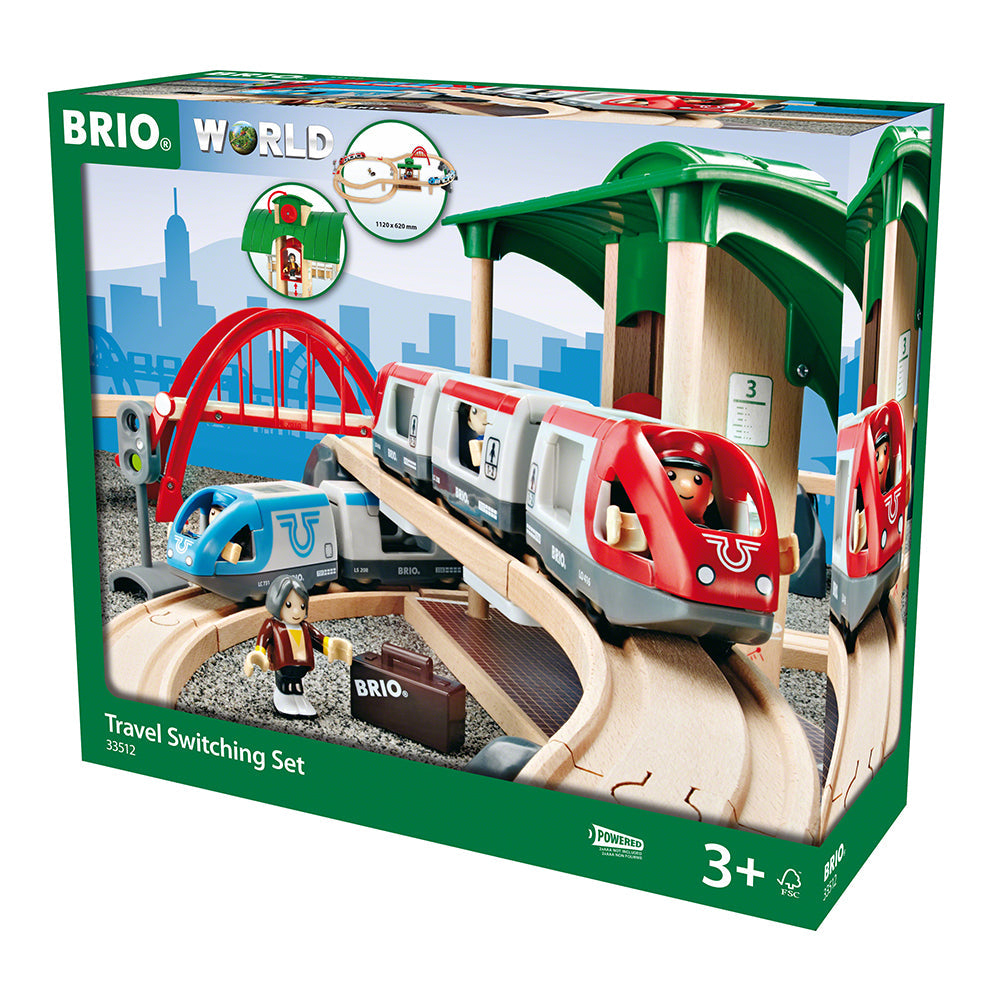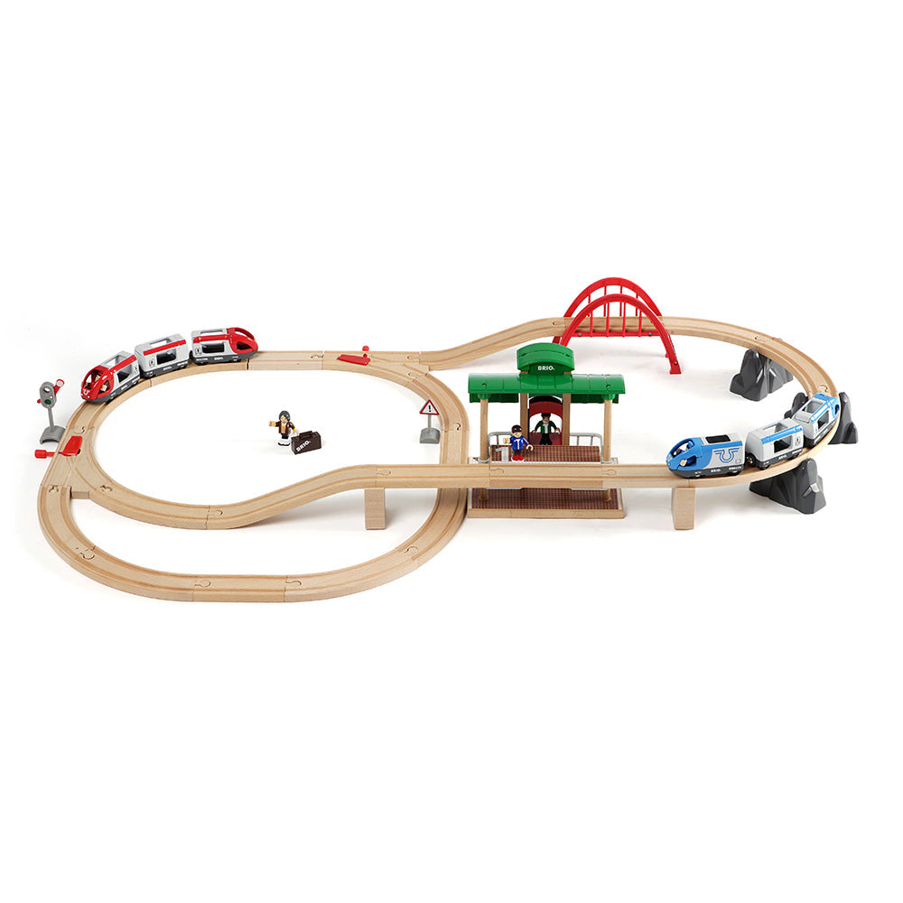 Set trenulet cu statie de legatura BRIO, este un set format din doua trenulete de pasageri cu locomotiva pe baterii, gara si un traseu complex de sine. Include 5 figurine.